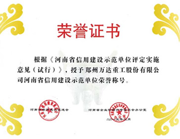 2016/01/28 558 熱烈祝賀鄭州萬達重工股份有限公司通過了河南省信用建設促進會和河南省企業(yè)信用評審委員會辦公室共同組織的河南省信用建設示范單位復審認證,被認定為河南省信用建設示范單位榮譽稱號!