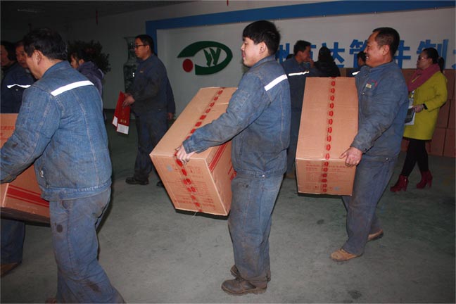 2015年2月4日下午13:00,公司組織的年終福利品發(fā)放工作在行政大廳熱鬧進(jìn)行。