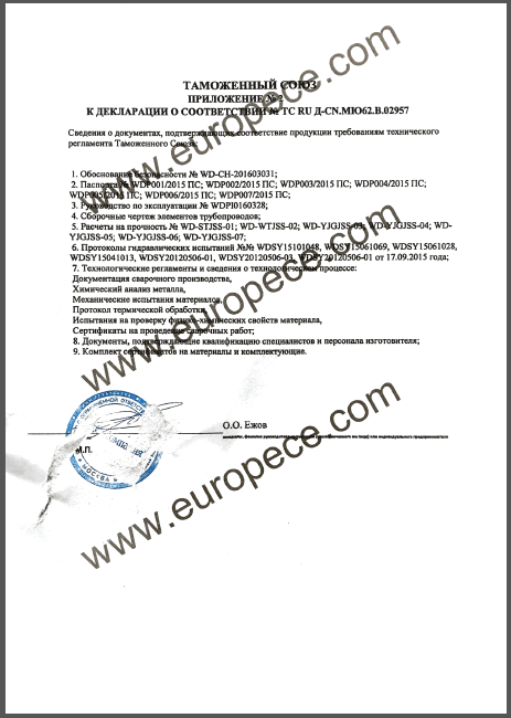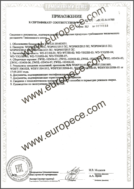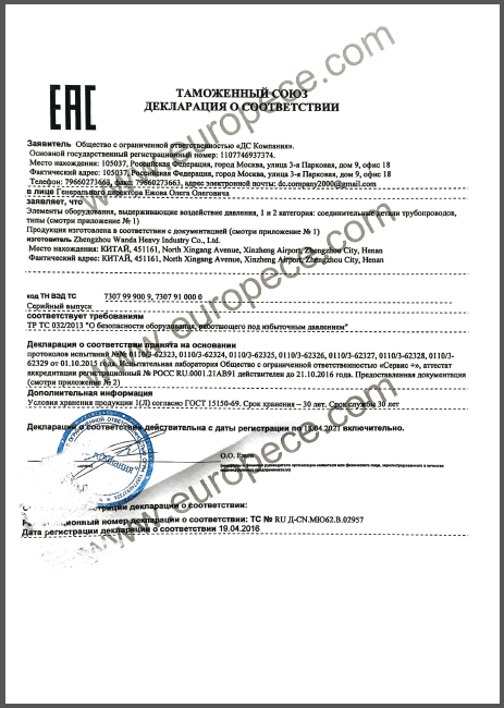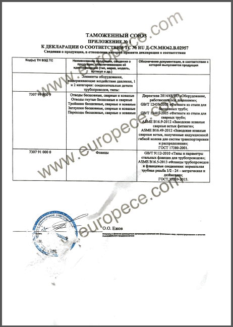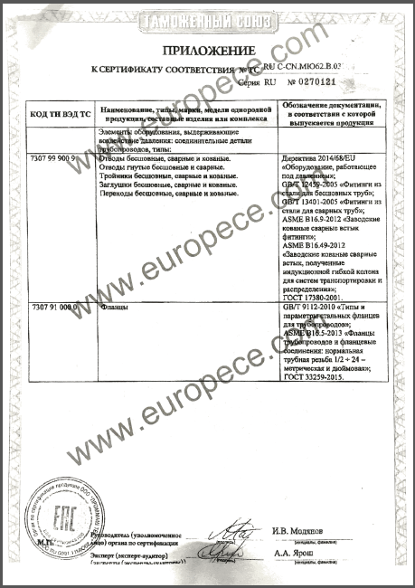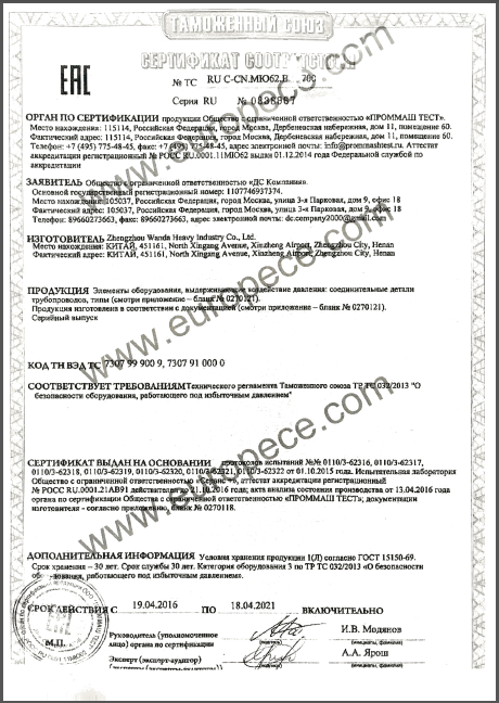 CU-TR認(rèn)證產(chǎn)品覆蓋萬達(dá)重工生產(chǎn)的彎管、法蘭等各類型產(chǎn)品,認(rèn)證證書的取得是俄白哈對萬達(dá)重工產(chǎn)品資料、安全標(biāo)識、產(chǎn)品性能的肯定,同時驗(yàn)證了萬達(dá)重工的產(chǎn)品質(zhì)量又邁上了一個更高的臺階。近年來,我公司積極開拓海外市場,把擴(kuò)大國際市場作為重要的發(fā)展戰(zhàn)略,此次CU-TR認(rèn)證證書的取得,為我司進(jìn)一步開拓歐洲市場提供了強(qiáng)有力的保證。
