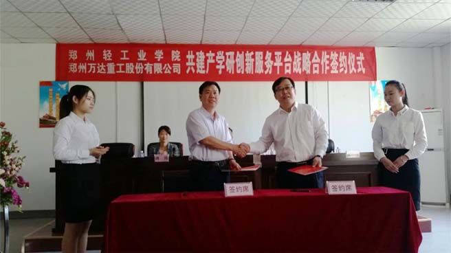 2016年9月21日,由鄭州萬(wàn)達(dá)重工股份有限公司與鄭州輕工業(yè)學(xué)院共同建立的產(chǎn)學(xué)研創(chuàng)新服務(wù)平臺(tái)戰(zhàn)略合作簽約揭牌儀式在鄭州萬(wàn)達(dá)重工股份有限公司順利舉行。