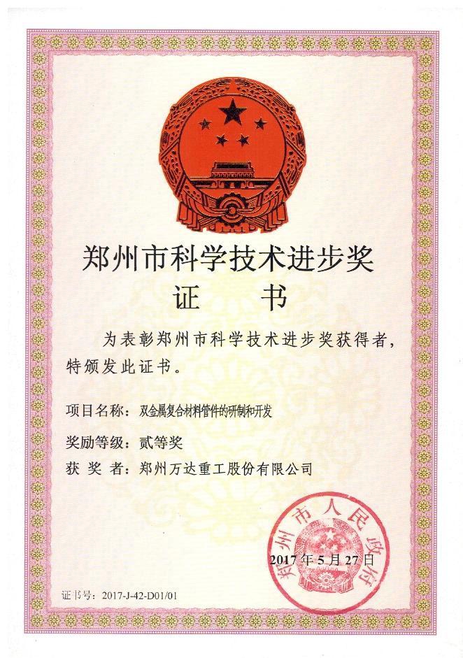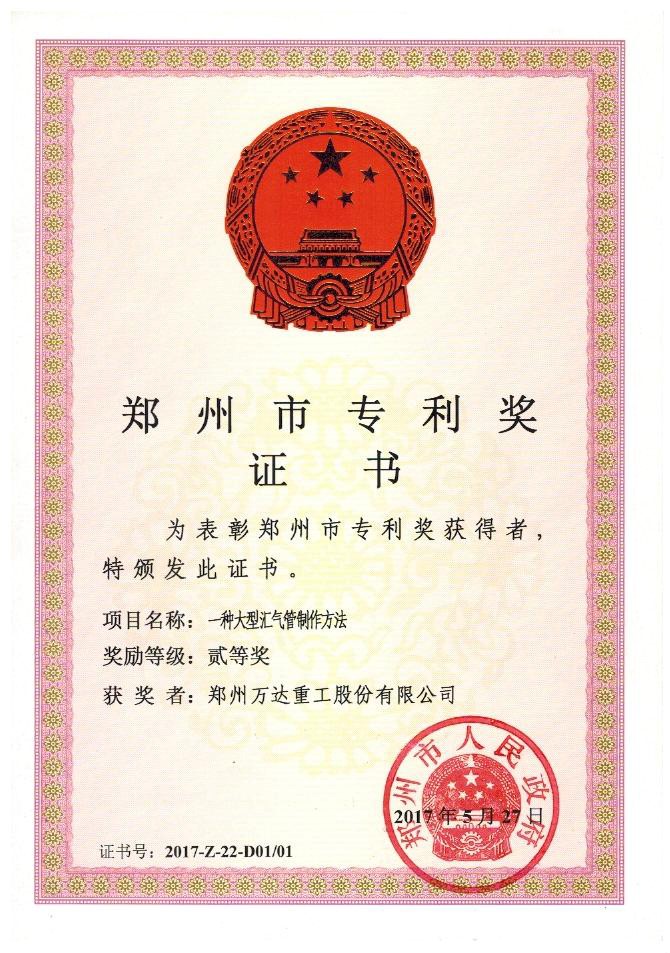 熱烈祝賀鄭州萬達重工股份有限公司“雙金屬復(fù)合材料管件的研制和開發(fā)”項目成果和“一種大型匯氣管制作方法”發(fā)明專利被鄭州市人民政府分別評選認(rèn)定為2017年“鄭州市科學(xué)技術(shù)進步獎二等獎”和“鄭州市專利獎二等獎”。