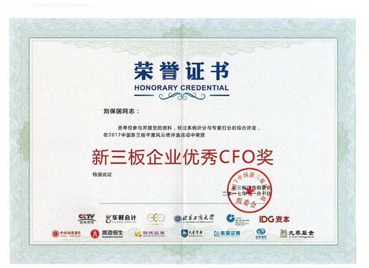 本次活動(dòng)依據(jù)華財(cái)新三板投資者保護(hù)指數(shù)、財(cái)務(wù)指標(biāo)等作為基本入圍條件,加上專(zhuān)家打分和網(wǎng)絡(luò)投票,歷經(jīng)3個(gè)多月最終確定獲獎(jiǎng)名單。鄭州萬(wàn)達(dá)重工股份有限公司憑借著深厚的文化底蘊(yùn),先進(jìn)的管理理念、精準(zhǔn)的財(cái)務(wù)數(shù)據(jù)等綜合實(shí)力榮獲“2017年中國(guó)新三板年度風(fēng)云榜”最佳公司治理獎(jiǎng);公司財(cái)務(wù)總監(jiān)劉保國(guó)先生憑借著專(zhuān)業(yè)的技術(shù)能力,優(yōu)秀的個(gè)人素養(yǎng)榮獲“2017年中國(guó)新三板”企業(yè)優(yōu)秀CFO獎(jiǎng)。