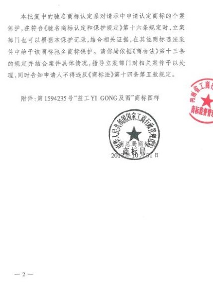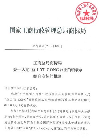 根據(jù)國家工商行政管理總局商標(biāo)局下發(fā)的商標(biāo)馳字【2017】108號(hào)《工商總局商標(biāo)局關(guān)于認(rèn)定“益工 YI GONG及圖”商標(biāo)為馳名商標(biāo)的批復(fù)》文件,公司使用在商標(biāo)注冊用商品和服務(wù)國際分類第6類金屬管道配件商品上的“第1594235號(hào)益工YI GONG及圖”商品被認(rèn)定為中國馳名商標(biāo)”,這不僅是公司商標(biāo)保護(hù)的重大成果,也實(shí)現(xiàn)了鄭州航空港經(jīng)濟(jì)綜合實(shí)驗(yàn)區(qū)馳名商標(biāo)零的突破。