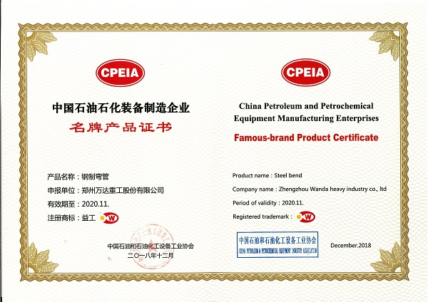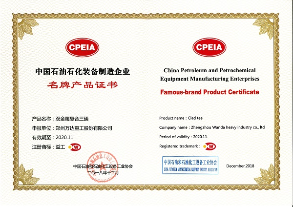 為了更好落實(shí)“中國(guó)制造2025”的發(fā)展戰(zhàn)略,培育企業(yè)具有科技創(chuàng)新水平的名牌產(chǎn)品,根據(jù)《中國(guó)石油石化裝備制造服務(wù)行業(yè)名牌產(chǎn)品評(píng)價(jià)推薦辦法》,按照中石協(xié)秘【2018】14號(hào)文的標(biāo)準(zhǔn)評(píng)價(jià),萬達(dá)重工 “益工”品牌“雙金屬?gòu)?fù)合三通”和“鋼制彎管”兩種產(chǎn)品被中國(guó)石油和石油化工設(shè)備工業(yè)協(xié)會(huì)評(píng)定為“中國(guó)石油石化裝備制造企業(yè)名牌產(chǎn)品證書”。