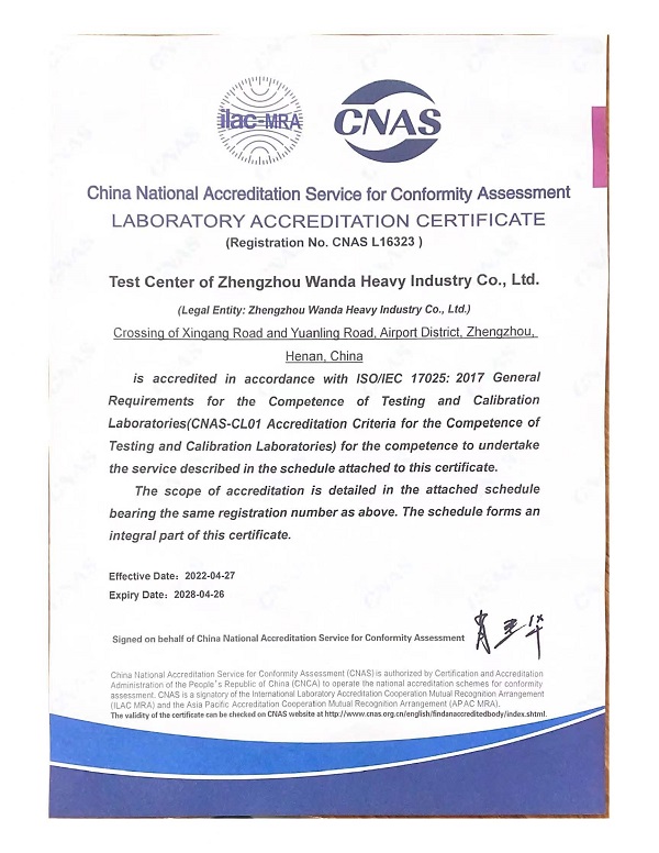 近日,鄭州萬達(dá)重工股份有限公司檢測(cè)中心順利通過中國(guó)合格評(píng)定國(guó)家認(rèn)可委員會(huì)(以下簡(jiǎn)稱CNAS)的審核,并獲得CNAS實(shí)驗(yàn)室認(rèn)可證書(注冊(cè)號(hào)L16323),這標(biāo)志著萬達(dá)重工在實(shí)驗(yàn)室建設(shè)、試驗(yàn)及檢測(cè)能力和質(zhì)量保障等方面取得了新的成果,代表著公司的技術(shù)能力和管理水平具備國(guó)際水準(zhǔn)的規(guī)范性和公信力,提升了品牌影響力和企業(yè)的核心競(jìng)爭(zhēng)力。