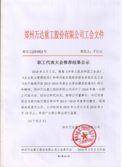 2018/03/08 3293 2018年3月5日,根據(jù)《中華人民共和國工會法》、《企業(yè)民主管理規(guī)定》和鄭州航空港經(jīng)濟綜合實驗區(qū)總工會《關于推薦評選2013-2018年度企業(yè)勞動模范的通知》的文件精神,鄭州萬達重工股份有限公司召開了2018年第一次職工代表大會。經(jīng)會議研究決定,推薦公司董事長、書記何清同志為鄭州航空港區(qū)鄭州市20132018年度勞動模...
