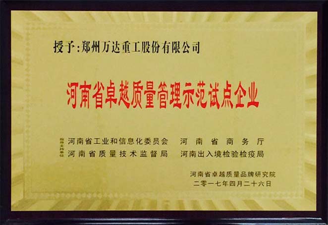 熱烈祝賀鄭州萬達重工股份有限公司榮獲“河南省卓越質量管理示范試點企業(yè)”榮譽稱號!